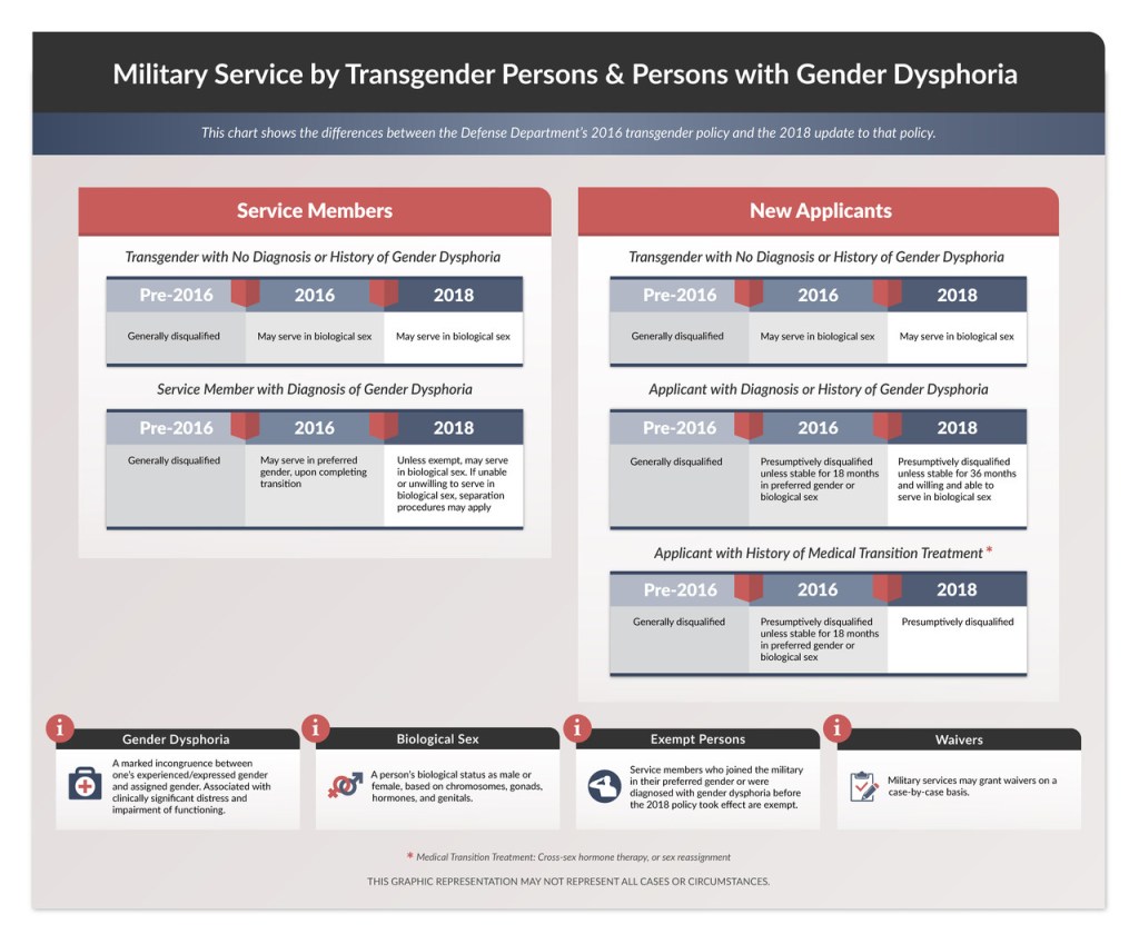 According to the Human Rights Campaign, President Trump announced in 2017 that the military will no longer accept transgender people in a series of tweets. Many states and other government officials were against it. In January 2019 the supreme court voted in favor for the ban (5-4). On April 12, 2019 the ban went into place. The Department of Defense (DoD) says the is not a ban on transgender people, but a ban on gender dysphoria. Gender dysphoria, according to the Diagnostic and Statistical Manual of Mental Disorders (DSM-5) is a difference between a person’s experienced/expressed gender and assigned gender, also significant distress or problems functioning.