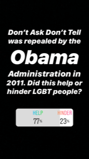 - To your knowledge did Don’t Ask Don’t Tell (A policy made by the Clinton Administration for LGBT people in the military) help or hinder LGBT people?