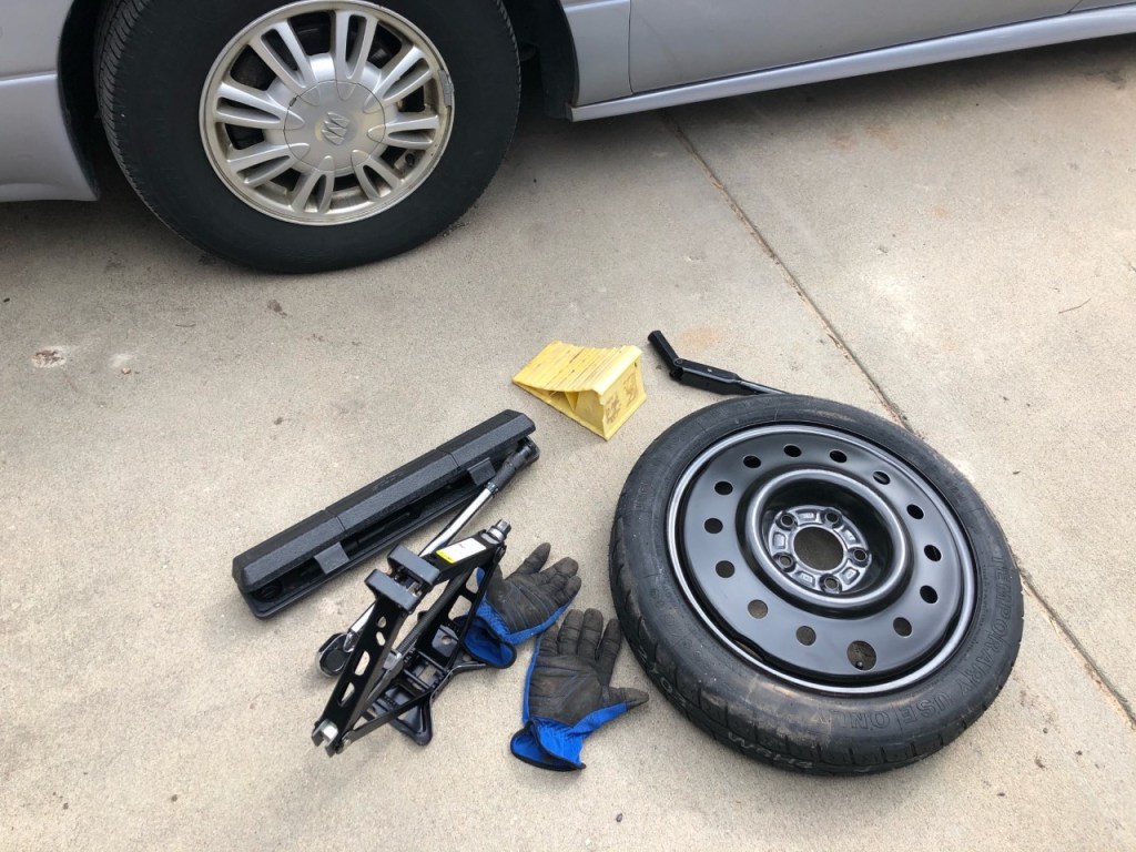 Here’s some things you need to keep in mind before you find yourself in this situation. Ask yourself where your spare tire kept, how do you retrieve it, and what good is it if it’s just as flat as your current tire. So you should check your spare tire periodically and understand all the tire changing steps. You should also keep in mind what to do when you make it to the side of the road. It’s important to identify which tire is flat and which wheels need to be blocked off, typically the wheel opposite to the flat. You should also turn on the E brake. Lastly you should know that changing your own tire is only good enough for you to get home or to the nearest mechanic. Now is a good time to grab all your materials and lay out in front of you.