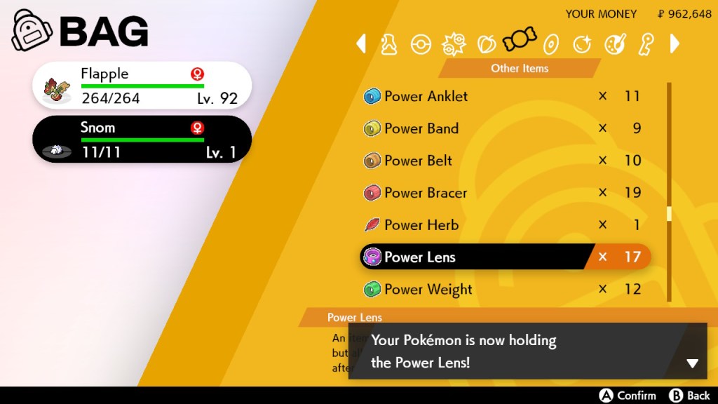 Once you have determined what your Pokémon’s EV spread will look like, you can then start battling wild Pokémon to EV train your Pokémon. Before EV training, remember to put EV training items on your Pokémon so that it will gain EVs faster. The Macho Brace will allow the Pokémon to gain EVs two times faster. The Power Anklet, Power Band, Power Belt, Power Bracer, Power Lens, and Power Weight will give eight EVs in whichever stat the item specifies for each Pokémon caught or defeated, no matter what EV yield the Pokémon has.