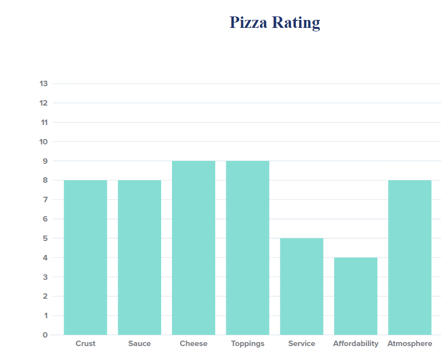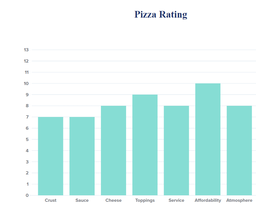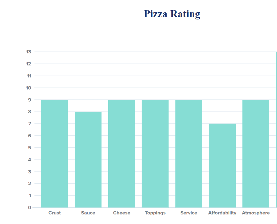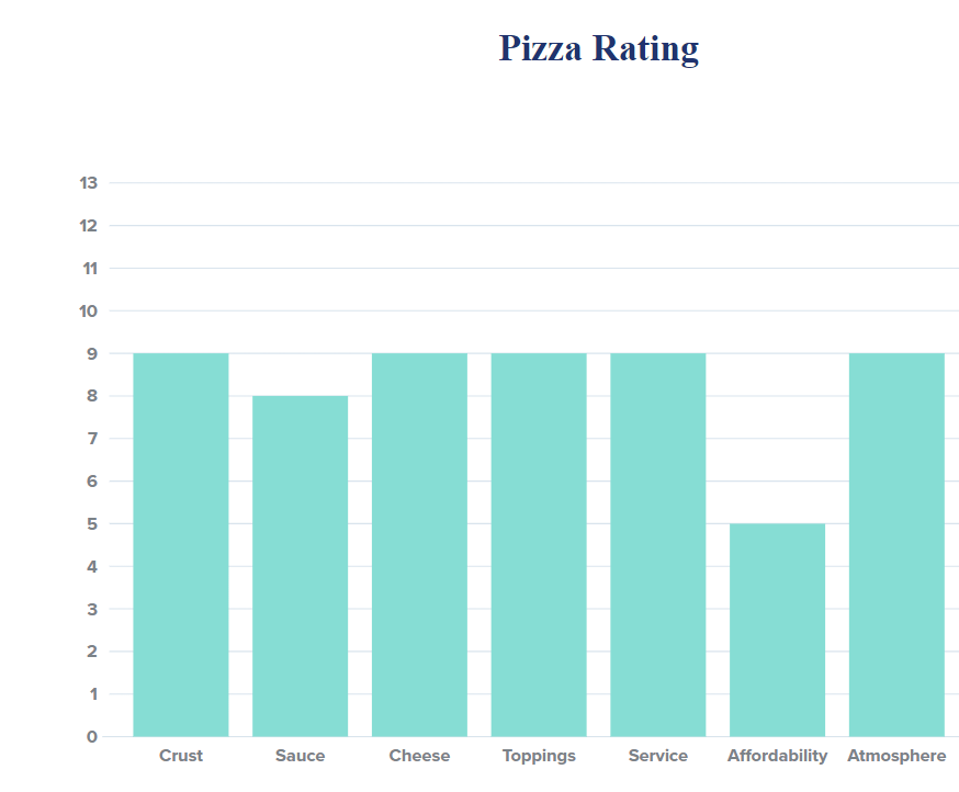 We rated crust an 8 because its decent crunch and not floppy. Sauce was an 8 because it was home-made and not drenched. Cheese was an 8 because it was stringy and stretchy. Toppings were an 8 because there was a lot of them and they were flavorful. Service a 9 because our server was really kind to us for the first time. Affordability an 8 because its not the cheapest if you don’t go on a Friday night, and it would be a bit more expensive to go as one or two people. Atmosphere an 8 because its really chill and is really family friendly.