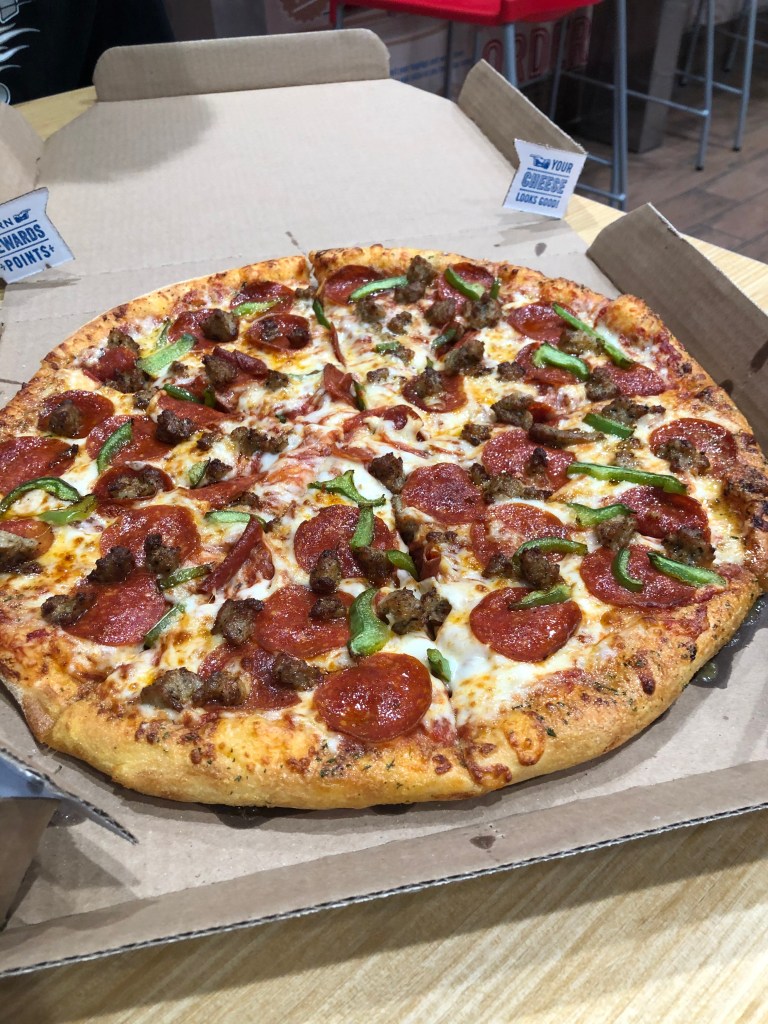 The crust was a 5, its just there to hold everything. The sauce had alright taste, plentiful in some spots. The cheese was a 6, not very flavorful. The toppings was a 7, every other restaurant did them better in every way. The service was nice though, minimum communication. Atmosphere was an 8 because it just feels stuffy and claustrophobic. The price was a 9, you get what you pay for and was in line with Domino’s.